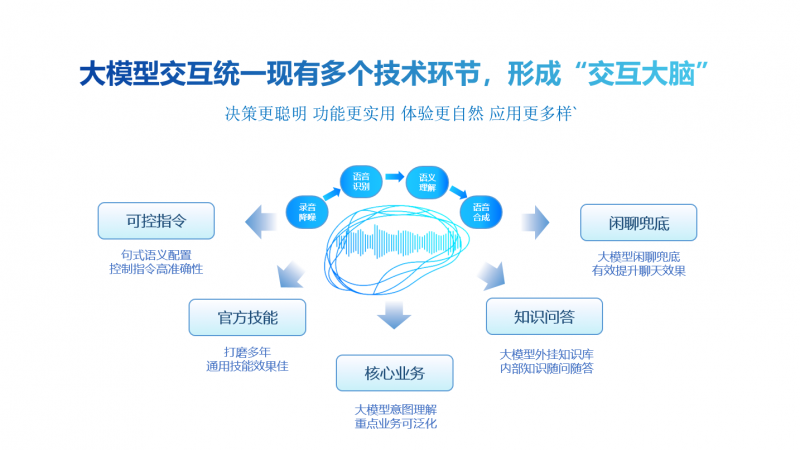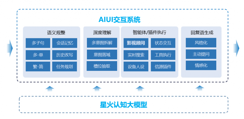 讯飞 AIUI 平台依托于讯飞星火大模型底座完成了全面升级,统一了现有多个技术环节,形成了一个更智能的交互大脑。它不仅能够无缝复用 AIUI 平台在天气、音乐、故事等通用领域的多年官方技能效果,还针对用户需要自定义的命令控制场景开放了文法自定义配置。针对用户需要重点泛化的核心业务场景,开放了大模型智能体的自定义接入,只需简单的 Prompt 配置,大模型的意图理解准确率即可在开放场景下达到优秀水准。